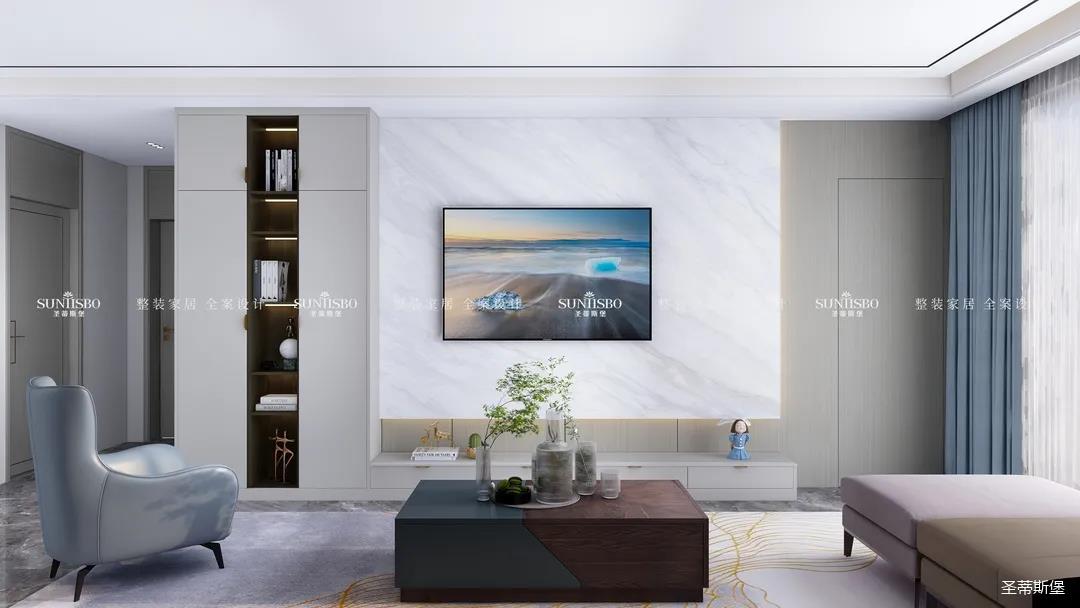优雅浅灰L型定制柜与纹理清晰的大理石组合电视墙,满足了业主审美与实用的双向需求。一张淡蓝色的休闲椅,让业主能感受到亮丽明艳色彩之外的独特,低调不张扬,却在温润中传递出色彩的力量。通过纹理清晰的护墙为底,为柔和优雅的静态客厅增添了层次感十足的空间律动。
